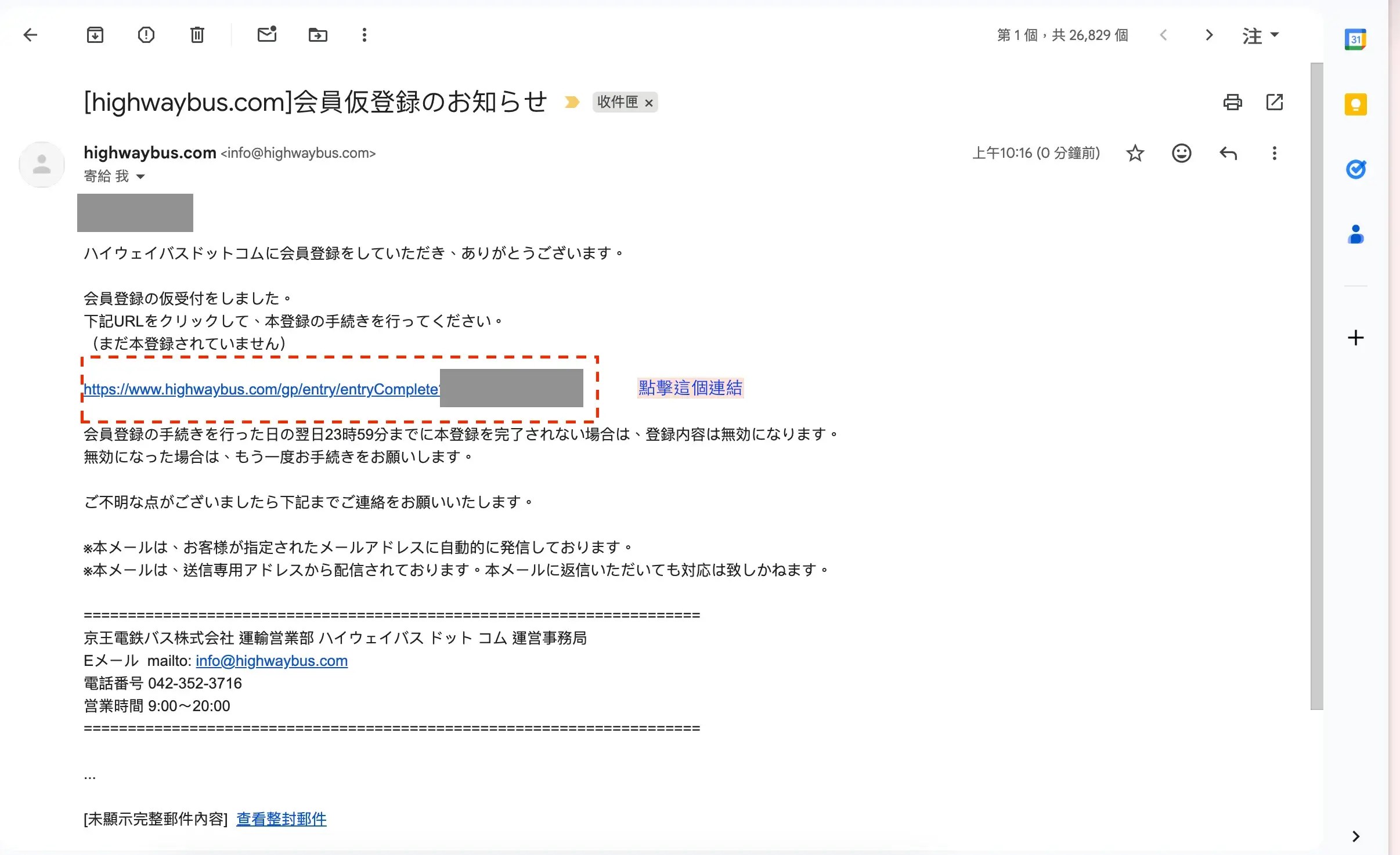 信箱會收到一封主旨是 [highwaybus.com]会員仮登録のお知らせ的信,點開信中會有一個超連結。