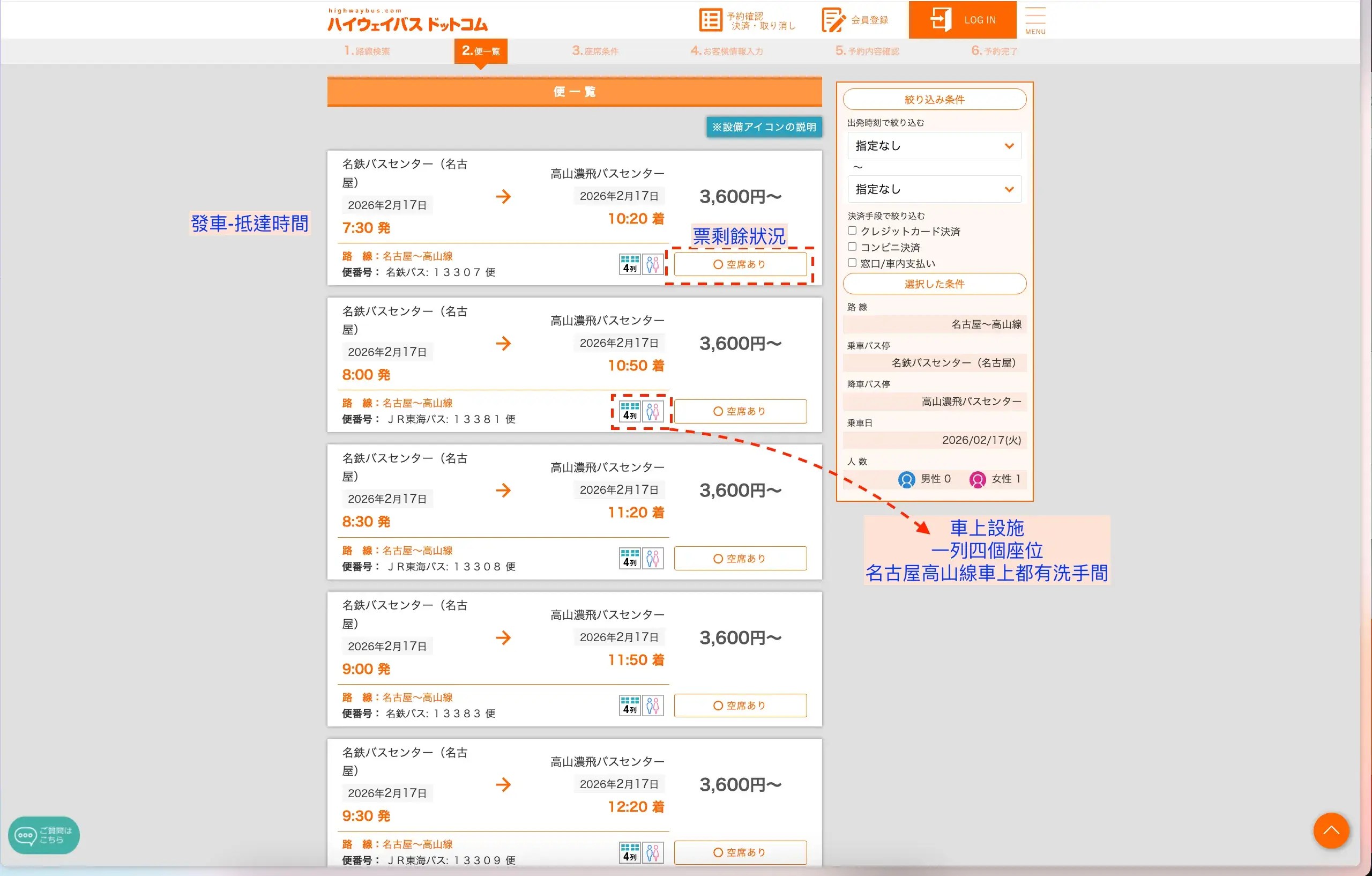 名古屋到高山巴士車票一般不難買,圖中我 1/17 實際搜尋隔天 1/18 的車次,每個班次都還有一些空位。