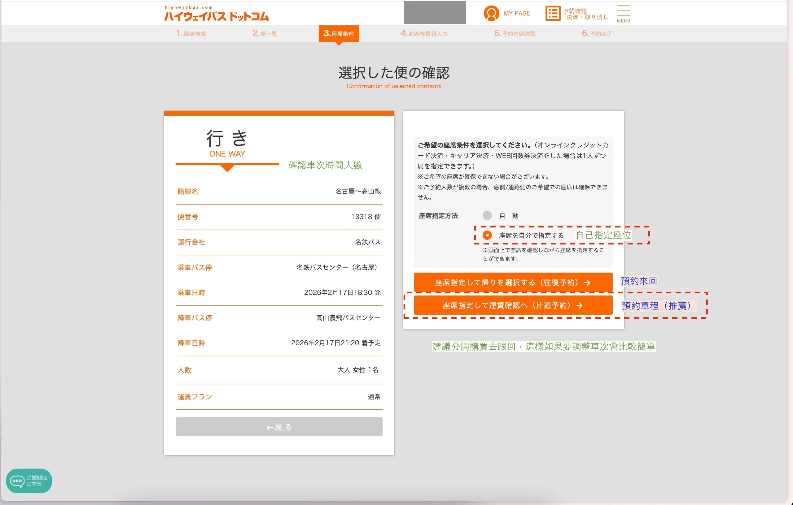 通常我們去高山一定是來回,但我個人建議即使來回名古屋高山都搭乘高速巴士,訂票的時候也來回「分開」訂票。
