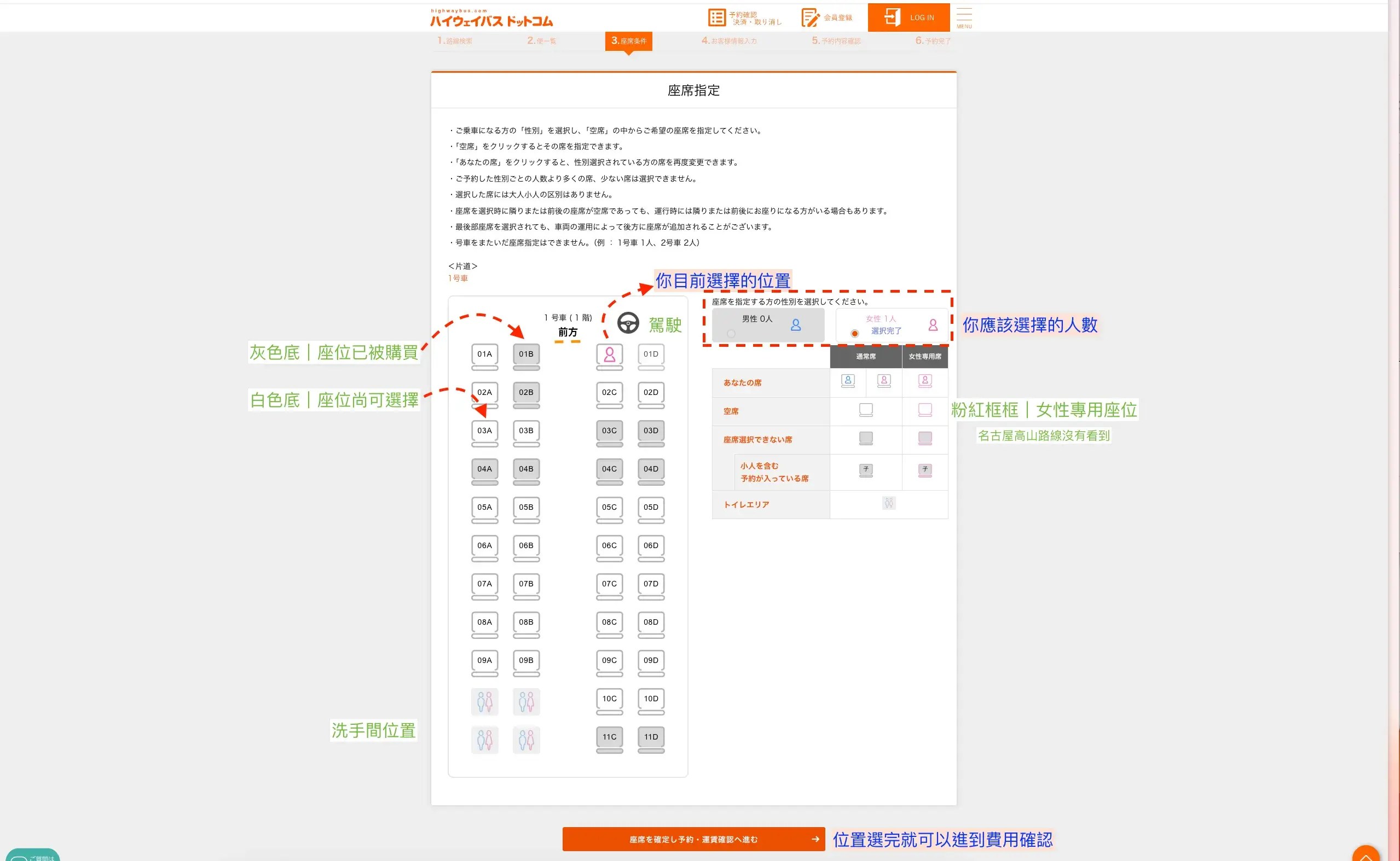 如果有看到白底但是粉紅色框框的空位,表示是女性專屬座位,但是名古屋高山路線沒有。