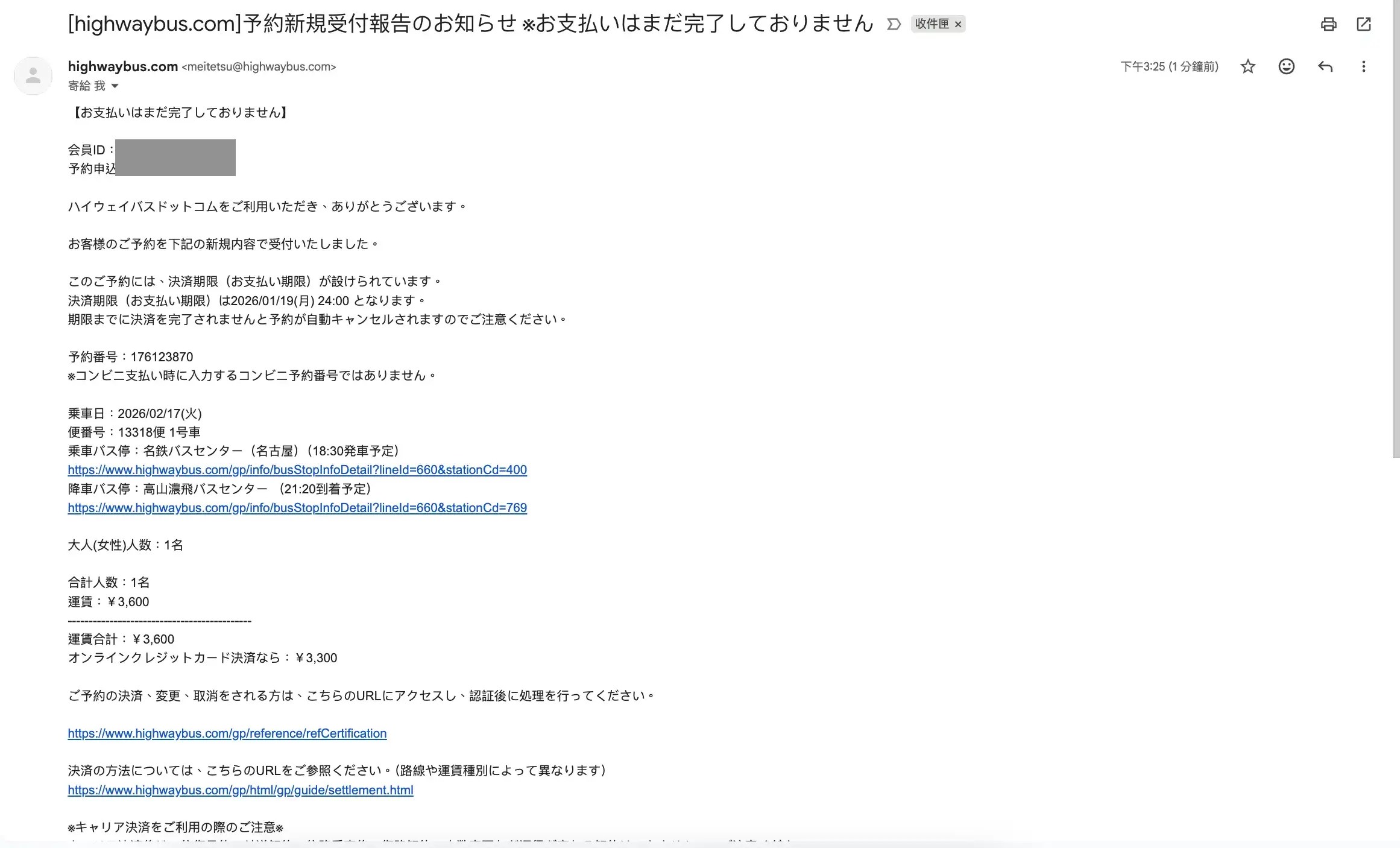 同時信箱也會收到主旨為「[highwaybus.com』予約新規受付報告のお知らせ※お支払いはまだ完了しておりません 」的信,提醒你有預約但是尚未付款。