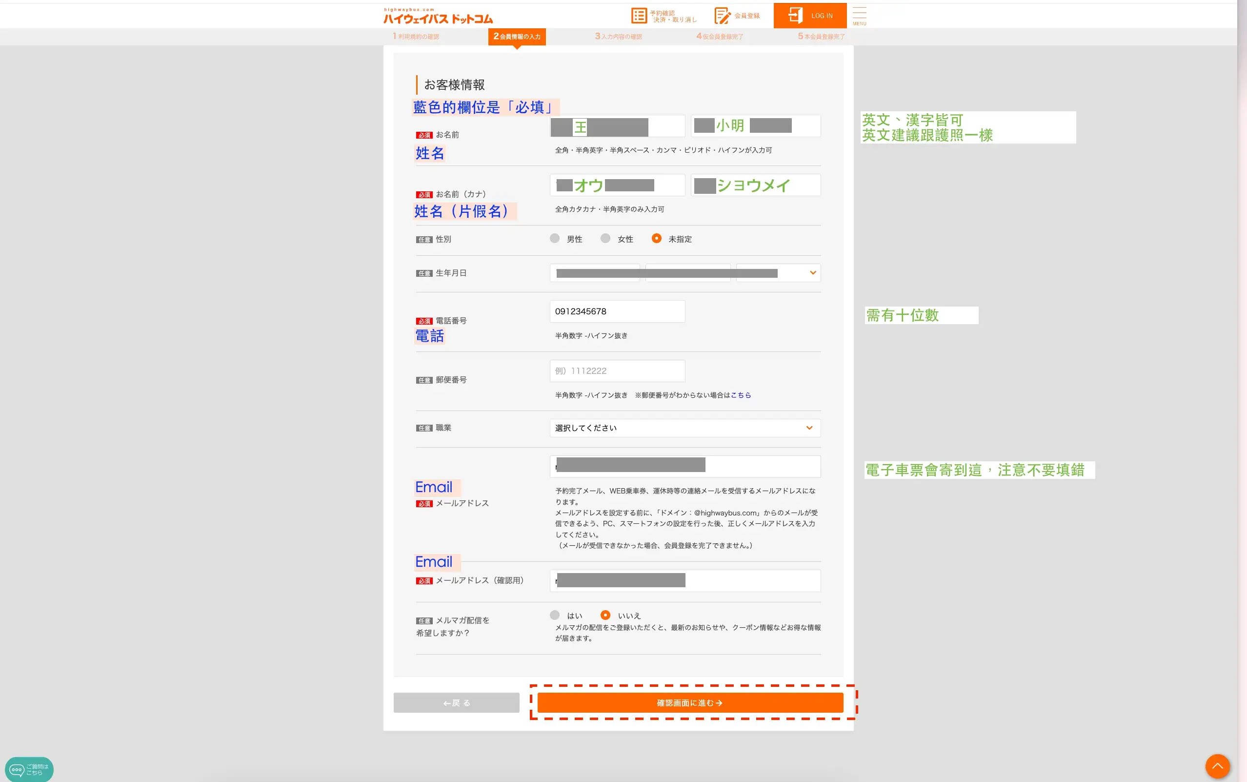 這步驟很簡單,就是確認前面填的資訊對不對,然後按下最下面紅框「仮登録する→(臨時註冊)」